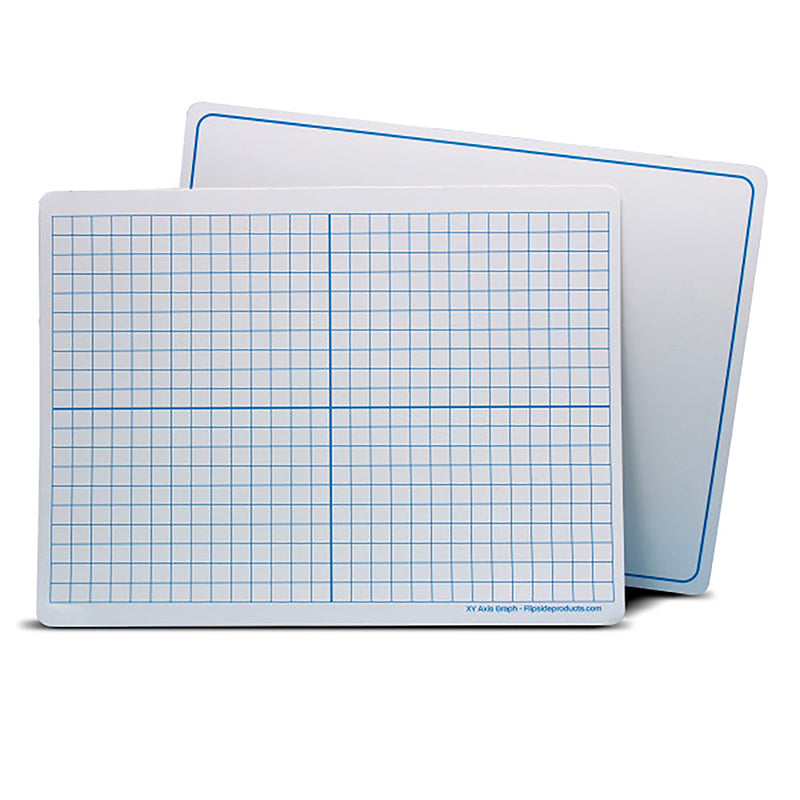 Two-sided, XY Axis Dry Erase Learning Mats are great for teaching and practicing mathematics fundamentals. The bright white sheets have bold blue lines separating the mat into quadrants, each 14 squares by 10 squares. Total grid is 28 squares by 20 squares. Individual squares measure 3/8" x 3/8". The back side is plain white dry erase with a blue border. Both sides of the learning mats are magnetic receptive allowing for use with magnetic manipulatives. The mats feature a high-quality, non-ghosting write-and-wipe surface with smooth, rounded edges and corners. Each sheet measures 9" x 12". Each pack includes 24 individual mats.